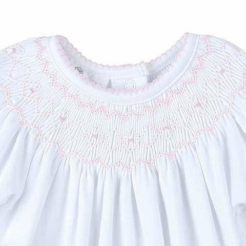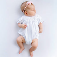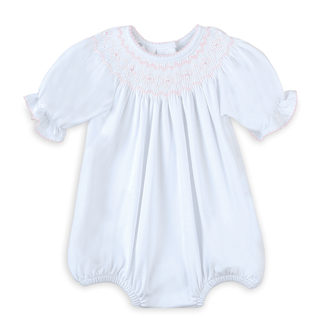 Features a classic bishop neckline and short sleeves in soft pink. Blends classic charm with comfortable, playful design. Features: * 100% Pima Cotton: Exceptionally soft, breathable fabric. * Neckline Style: Classic bishop neckline for timeless appeal. * Sleeve Style: Short sleeves for warmer weather comfort. * Snap Closure: Easy dressing and quick diaper changes. * Silhouette Style: Roomy bubble allows active, comfortable play. Benefits: * Great Comfort: Cool and soft on baby's skin. * Visual Appeal: Timeless, elegant and adorable aesthetic. * Easy Care: Simple machine wash for effortless upkeep. * Mix and Match: Coordinates with other pieces from the collection! Dress baby in charming, airy comfort!