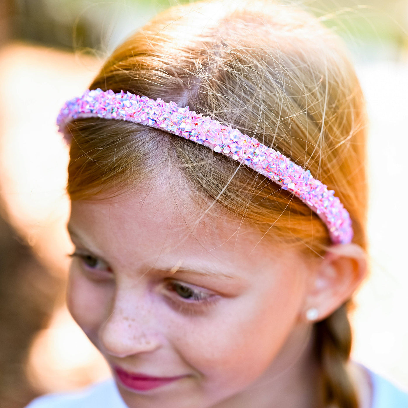* Thin headband made with chunky iridescent sequins *Flexible 13" size to best fit kids to tweens * Thin 0.5" width headband * Non slip velvet inner material.
