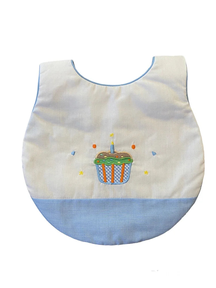 What a fun accessory for your baby's birthday party! This adorable white bib features an appliqued cupcake with candle and blue checked trim.