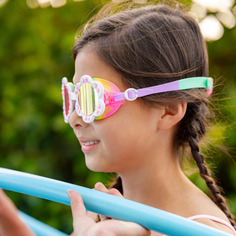 Bring a burst of sunshine to swim time with the Dandi Flower Sunlit Sherry Kids' Swim Goggles! Perfect for young swimmers aged 6 years and up, these goggles offer a fun and colorful look. Crafted from 100% silicone and latex-free materials, they ensure comfort and durability. The anti-fog lenses provide clear underwater vision, while UV protection keeps young eyes safe. The easy back clip guarantees a secure, tangle-free fit, combining charm with practicality. Each pair includes a hard protective case, making these goggles a must-have for kids who want to swim with style and joy.