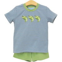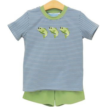 A fun take on a warm weather staple, the Hooked on Fishing Short Set is designed for comfort and easy style. The sleeveless top features a striped bodice with embroidered fish across the chest, adding personality while keeping the look classic. Paired with coordinating shorts, this set offers a relaxed fit with an elastic waistband that allows for all day movement. Great for playdates, outings, and everyday wear, this set is a practical option with just the right amount of charm.