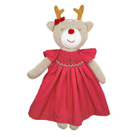 This hand-knit reindeer doll comes with an adorable solid red smocked dress that can easily match to any holiday or Christmas outfit.
